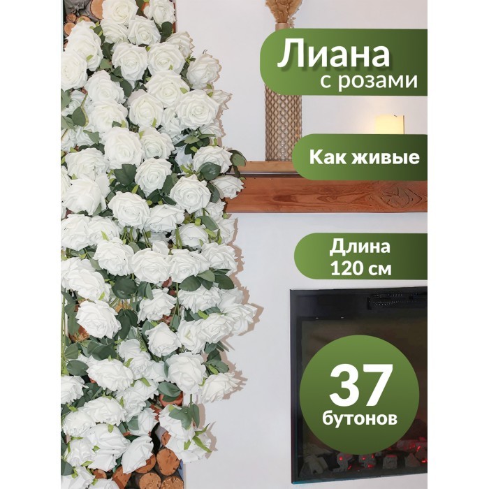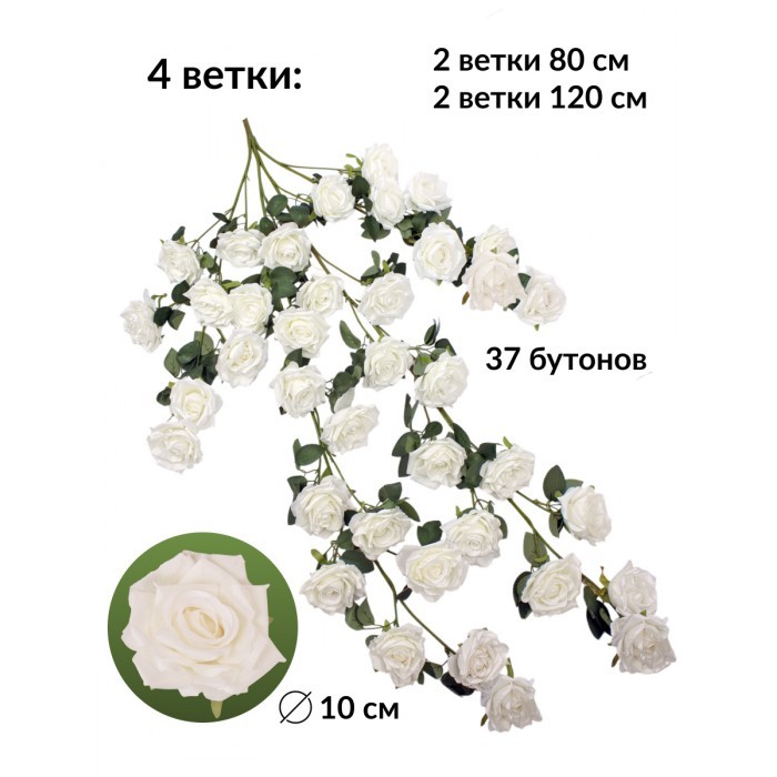 Цветы искуственные Розы каскадные (37 штук, 120 см, цветок 10 см) белый 265453
