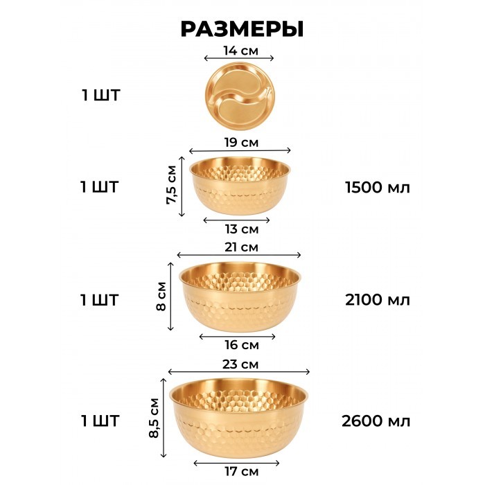 Набор Мисок из нержавеющей стали (соты) 3шт (19см-1шт+21см-1шт+23см-1шт+менажница 14см) золото 265526