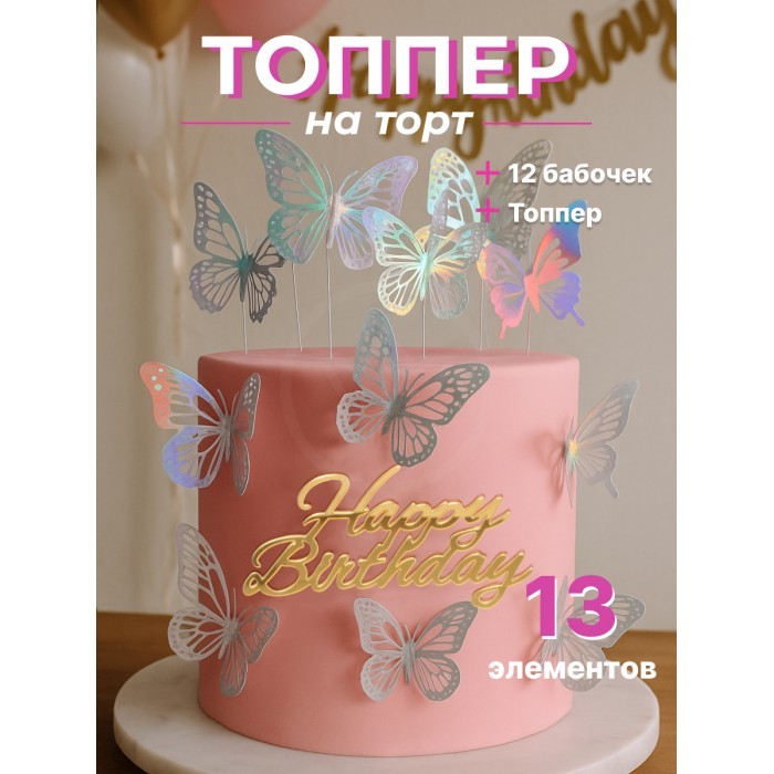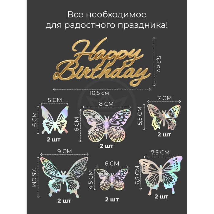 Топпер зеркальный Happy birthday+Бабочки 6 шт, золото 266156